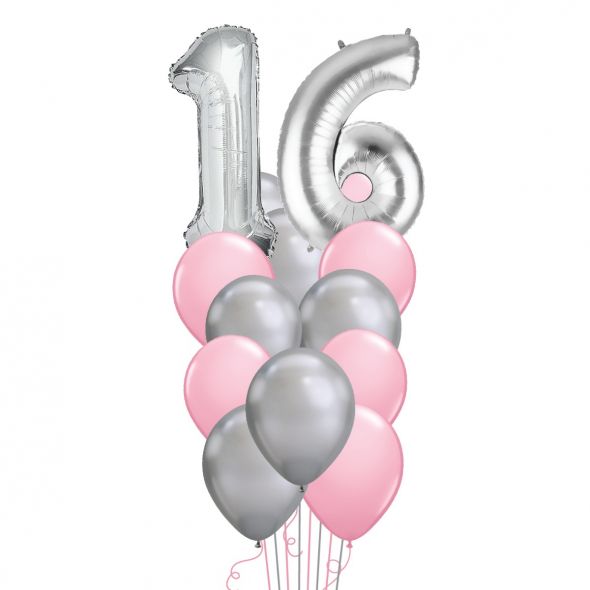 This includes one Number 16 silver foil balloon, five pearl pink balloons, five chrome silver balloons and a weight.